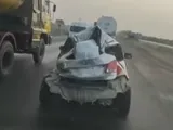 Auto schiacciata tra due camion: il guidatore sopravvive [Video]