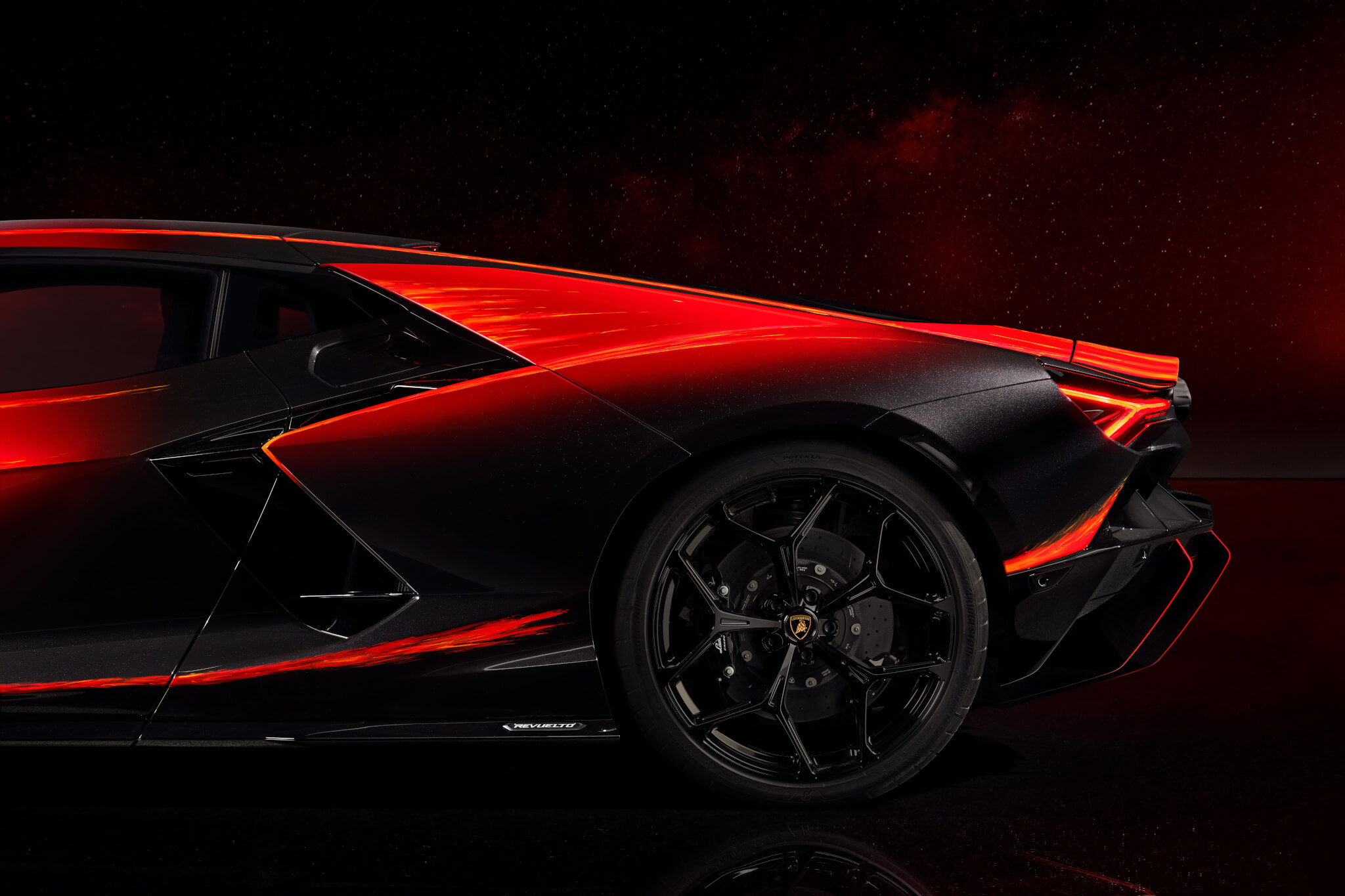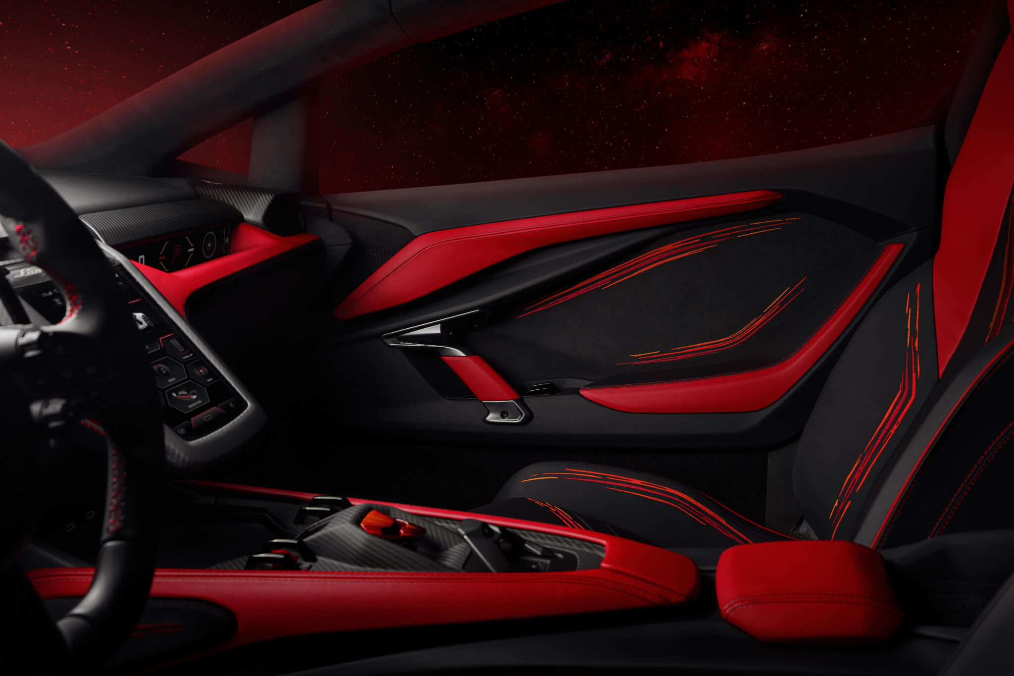 Per ottenere un simile effetto sono state necessarie 480 ore di lavoro, a cura di artigiani altamente specializzati, che hanno svolto il loro compito con pazienza certosina e con straordinaria abilità professionale. Il risultato aggiunge note spaziali al design esterno da astronave della Lamborghini Revuelto, rendendola come un mezzo che attraversa il cosmo verso la stella più luminosa della costellazione del Toro, in linea con la strategia Direzione Cor Tauri di Lamborghini, legata all’elettrificazione del marchio.